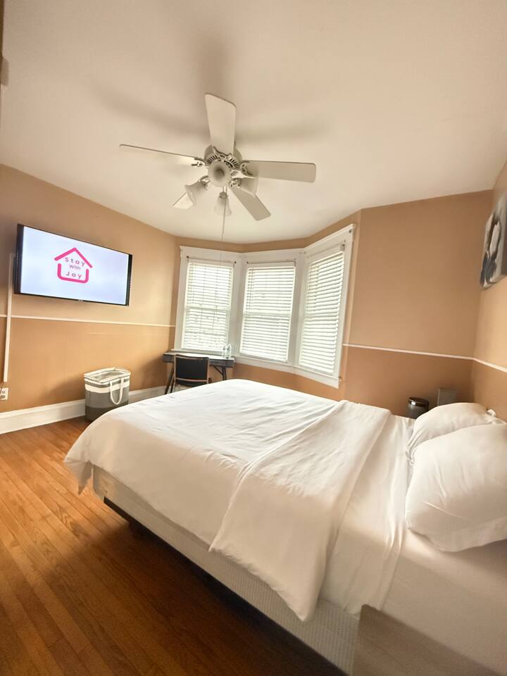 Welcome to to a spacious shared residence with over 2,500 sq. ft. of living space. This is a true shared living experience, offering a balance of privacy and community. Located on West 100th Street in Cleveland, our residence was retrofitted for comfort, privacy, and an easy contactless stay. Whether youâve booked a private room or one of our larger suites, every detail here supports a peaceful, independent guest experience. đż Shared Spaces Guests have access to the shared kitchen for light cooking and meal prep. The kitchen is fully equipped with all essentialsâmicrowave, stove, refrigerator, coffee maker, dishes, and cookware. Please clean up after use and respect quiet hours in shared spaces. If youâve booked one of the two private rooms, youâll share a full bathroom with one other guest. All other suites (300+ sq. ft.) include private en-suite bathrooms. đïž Private Suites Each suite features a private entrance code, Smart TV, office desk and chair, full-length mirror, and high-speed WiFi. Two suites include a mini-fridge, and the third will soon have one installed. Every space is designed to feel fully private and self-contained, offering the freedom of an apartment with the simplicity of a managed stay. đ§ș Laundry Access Laundry service is available through a Laundry Pass, which can be purchased depending on your length of stay. Instructions are shared digitally before check-in. đ„ Host & Privacy A StayWithJay host resides on-site in private quarters (typically the lower level). Hosts are available for assistance and light conversation but will never intrude on your stay. All communication and transactions are handled digitally to maintain a touchless, professional environment. Youâll always have privacy unless you request help. đ Guest Experience Check-in and verification are fully contactless. Every guest completes a secure virtual check-in and signs our rental agreement before arrival, ensuring a smooth and transparent process. We respect guestsâ personal space and expect the same courtesy toward our hosts and other residents. Ceiling fan for added airflow Smart TV with streaming apps Dedicated workspace with high-speed WiFi Two fresh towels provided Closet & storage space for longer stays Shared full bathroom nearby. If your creed, religion, or prejudice prevents you from interacting with people from any background or lifestyle, we strongly encourage you NOT to book with us, as discriminatory behavior will not be tolerated. Common areas are cleaned daily for a consistently tidy space. Respect for all guests and shared spaces ensures a comfortable experience for everyone.