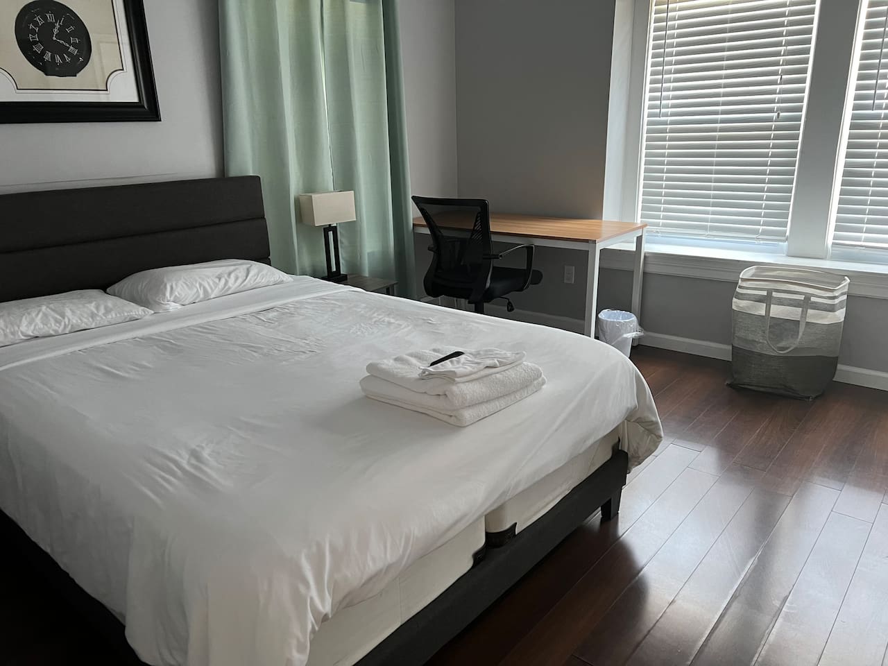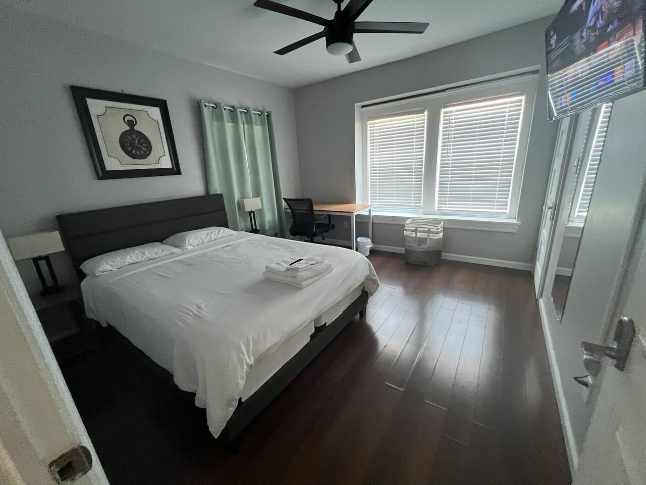 a peaceful, sunlit 2nd-floor room with two windows—one facing east for gorgeous sunrise vibes. Enjoy 160 sqft of private space. A workstation and smart TV. Located just steps from the shared full bathroom. 10 min to Progressive Field, the GoLuxRoom is for solo travelers, students, and professionals. Full kitchen, shared laundry*, and fast WiFi included. No unregistered guests. Free Street Parking | Driveway slots also available** | Must complete virtual check-in prior to arrival.***